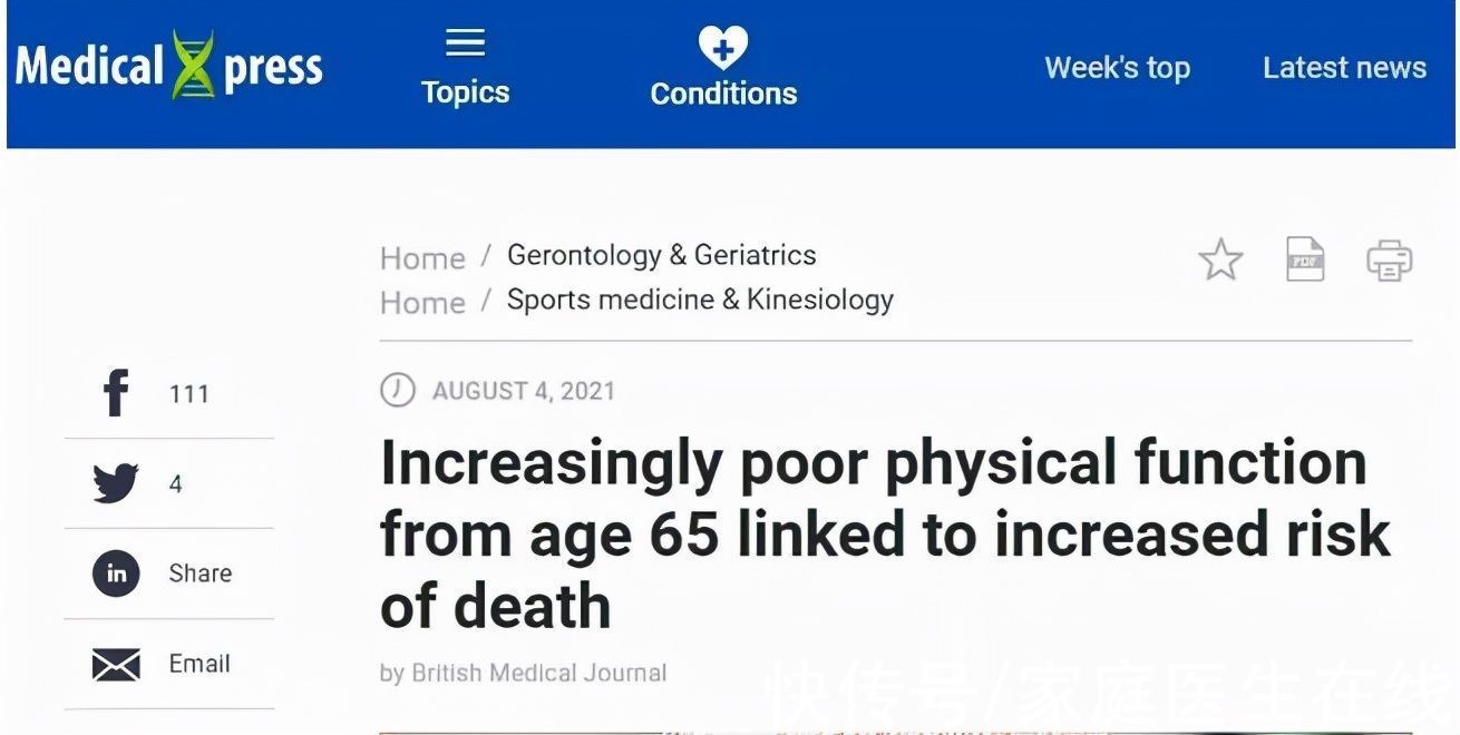 《英国医学杂志》研究显示,人到65岁之后运动能力会越来越差,死亡风险会越来越高。这项研究长达10.6年,研究人员发现运动能力和死亡风险有关,而且随着年纪的增长,这个关联性会越来越强。例如,平常人走路速度一般是每米0.9秒,而老年人速度少于这个数,或会增加死亡风险。