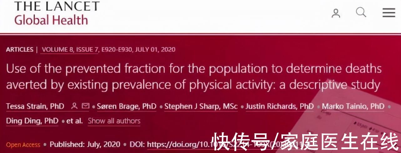 《柳叶刀·全球健康》发表了这样一项研究报告,报告指出,在全球范围内适度运动,每年能让390万人免于过早死亡,运动预防了15%的过早死亡。
